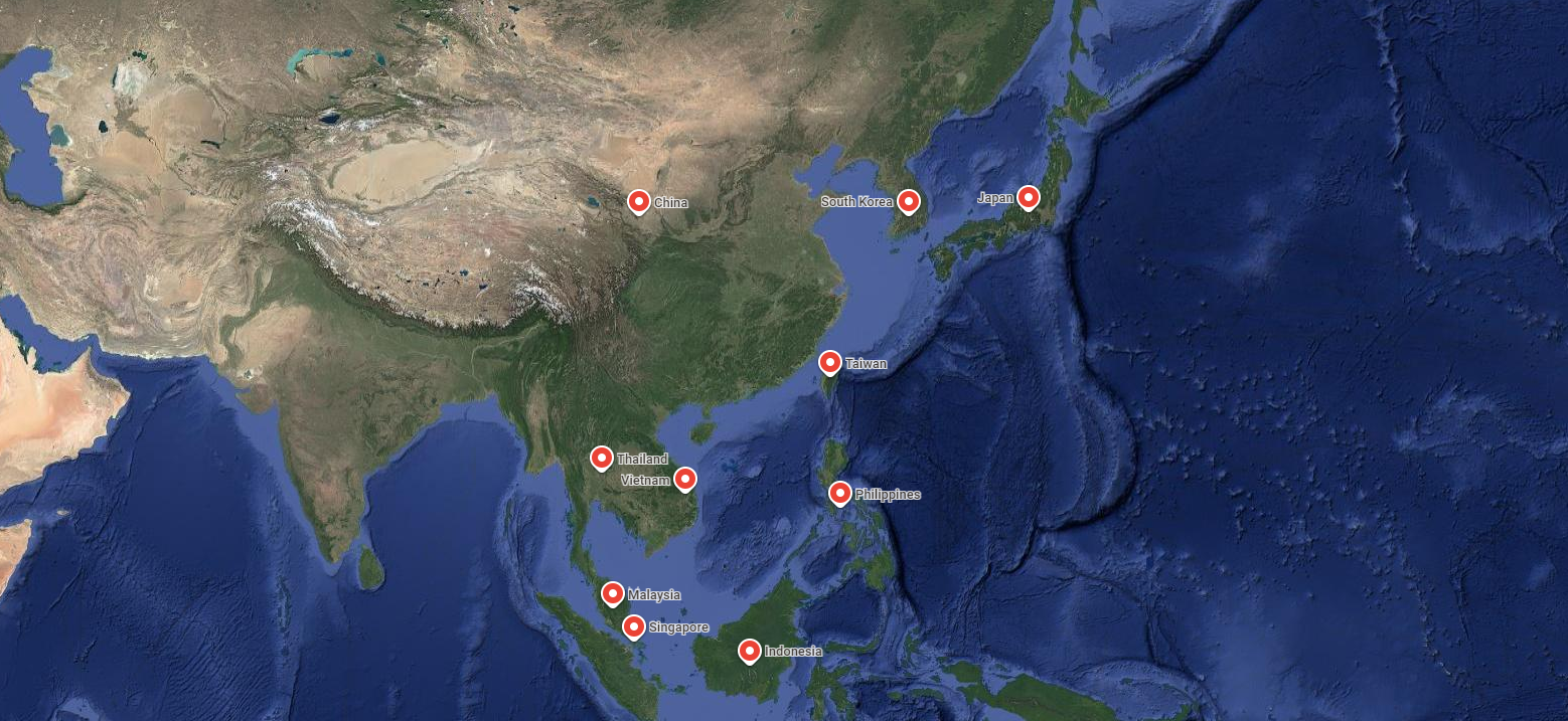 The service areas include: Chinese Mainland, Taiwan, China, Singapore, Malaysia, Vietnam, Thailand, the Philippines, Indonesia, South Korea, and Japan.